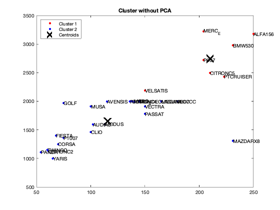 [dataNum, datatext, alldata] = xlsread('voiture.xls','voiture2'); DataKmeans=dataNum(:,1:7); %for i=1:10 %fixedCenter = randi([1 5],2,7) fixedCenter = rand(2,7) [idx,centres]=kmeans(DataKmeans,2,'Replicates',1,'Start',fixedCenter); figure; plot(DataKmeans(idx==1,1),DataKmeans(idx==1,2),'r.','MarkerSize',12) hold on plot(DataKmeans(idx==2,1),DataKmeans(idx==2,2),'b.','MarkerSize',12) plot(centres(:,1),centres(:,2),'kx',... 'MarkerSize',15,'LineWidth',3) legend('Cluster 1','Cluster 2','Centroids',... 'Location','NW') title 'Cluster without PCA' text(DataKmeans(:,1),DataKmeans(:,2),Individuals); hold off % end