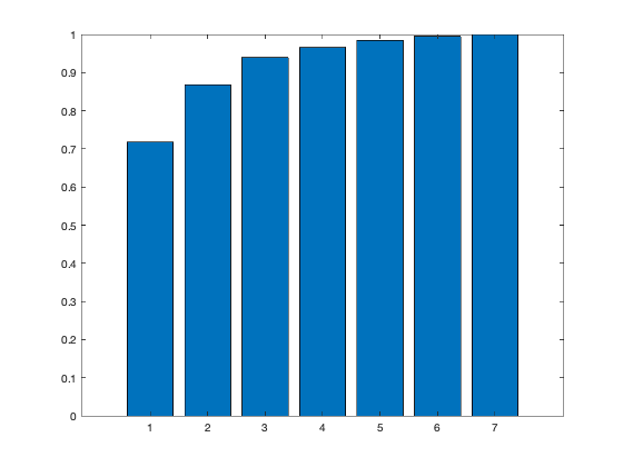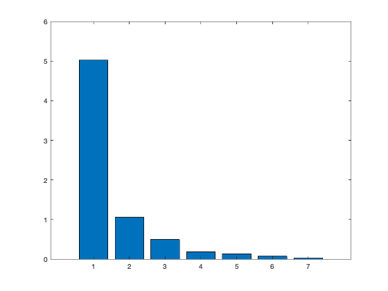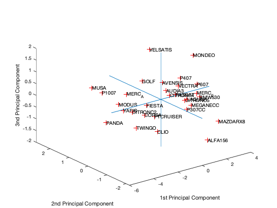 [coeff,scores,eigen_values] = pca(zscore(Data)); coeff % coordinates of variables in the projection space scores % coordinates of individuals in the projection space eigen_values % Eigenvalues %The following command is used to create the graph of the eigenvalues. figure('Name','Eigenvalue spectrum','NumberTitle','off'); bar(eigen_values); % And this gives us the cumulative inertias of the eigenvalues. Information_Percentage = cumsum(eigen_values)./sum(eigen_values) figure('Name','% of cumulative inertia','NumberTitle','off'); bar(Information_Percentage); % This command is used to produce the factorial map of individuals on % the two main axes figure('Name','individus','NumberTitle','off'); plot(scores(:,1),scores(:,2),'r+'); text(scores(:,1),scores(:,2),Individuals); a = axis; xl = a(1);xu = a(2);yl = a(3);yu = a(4); xlabel('1st Principal Component') ylabel('2nd Principal Component') hold on line([xl xu],[0 0]) line([0 0],[yl yu]) %axis 1 axis 3 figure('Name','individuals 1/3','NumberTitle','off'); plot(scores(:,1),scores(:,3),'r+'); text(scores(:,1),scores(:,3),Individuals); a = axis; xl = a(1);xu = a(2);yl = a(3);yu = a(4); xlabel('1st Principal Component') ylabel('2nd Principal Component') hold on line([xl xu],[0 0]) line([0 0],[yl yu]) %axis 2 axis 3 figure('Name','individuals 2/3','NumberTitle','off'); plot(scores(:,1),scores(:,3),'r+'); text(scores(:,1),scores(:,3),Individuals); a = axis; xl = a(1);xu = a(2);yl = a(3);yu = a(4); xlabel('1st Principal Component') ylabel('2nd Principal Component') hold on line([xl xu],[0 0]) line([0 0],[yl yu]) % In 3D figure('Name','individuals 1 2 3','NumberTitle','off'); plot3(scores(:,1),scores(:,2),scores(:,3),'r+'); text(scores(:,1),scores(:,2),scores(:,3),Individuals); a = axis; xl = a(1);xu = a(2);yl = a(3);yu = a(4);z1=a(5);zu=a(6); xlabel('1st Principal Component') ylabel('2nd Principal Component') zlabel('3nd Principal Component') hold on line([xl xu],[0, 0],[0, 0]) line([0 0],[yl yu],[0,0]) line([0 0],[0,0],[z1 zu]) % This command is used to create the circle of variable correlations % on the two main axes. figure('Name','Variables','NumberTitle','off'); plot(coeff(:,1),coeff(:,2),'*');