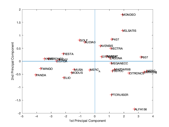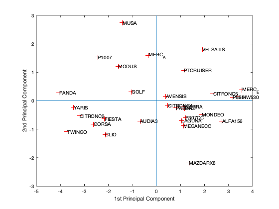 close all %Lamrous PCA program on notes [dataNum, datatext, alldata] = xlsread('voiture.xls','voiture2'); Data=dataNum(:,1:7); Variables = datatext(1,2:8) Individuals = datatext(2:31,1) %This allows you to generate a PCA %Attention, in the latest versions of Matlab, the "princomp" function is %called otherwise,try "pca"