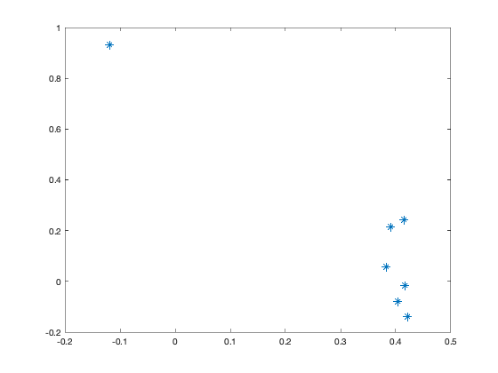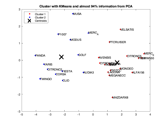 fixedCenter = rand(2,3) % Retain first three principal components selectedThree = scores(:,1:3); [idx,centres]=kmeans(selectedThree,2,'Replicates',1,'Start',fixedCenter); figure; plot(selectedThree(idx==1,1),selectedThree(idx==1,2),'r.','MarkerSize',12) hold on plot(selectedThree(idx==2,1),selectedThree(idx==2,2),'b.','MarkerSize',12) plot(centres(:,1),centres(:,2),'kx',... 'MarkerSize',15,'LineWidth',3) legend('Cluster 1','Cluster 2','Centroids',... 'Location','NW') title 'Cluster with KMeans and almost 94% information from PCA' text(scores(:,1),scores(:,2),Individuals); hold off eva = evalclusters(Data,'kmeans','Silhouette','KList',[1:2]..."maximum clustering can be 30, but we should work with two" ) eva = evalclusters(selectedThree,'kmeans','Silhouette','KList',[1:2]..."maximum clustering can be 30, but we should work with two" )